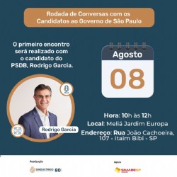 O primeiro encontro será com o atual governador e candidato à reeleição Rodrigo Garcia, do PSDB, no dia 08 de agosto, das 10h às 12h, no Meliá Jardim Europa, em São Paulo (SP).